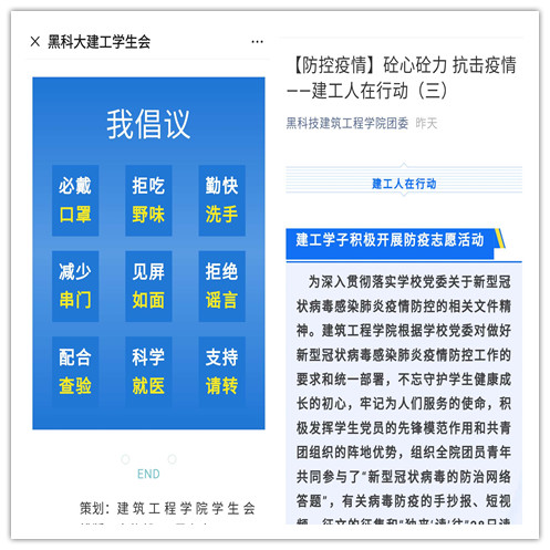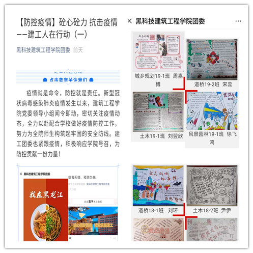 自1月24日起,学院各学生组织陆续通过微信、QQ空间等官方平台推送有关疫情防护知识、最新疫情消息、青年学子发声等10余篇,我院学生分会在官方微信公众号推送的《共战疫情,万众一心》一文,向全院学生通报最新疫情消息,并发出倡议:致敬前线、抵制谣言、积极防护。院团委在官方微信公众号推送《砼心砼力 抗击疫情》系列文章,多角度、多层次直击疫情、宣传呼吁、树立典型,积极传递青春正能量。