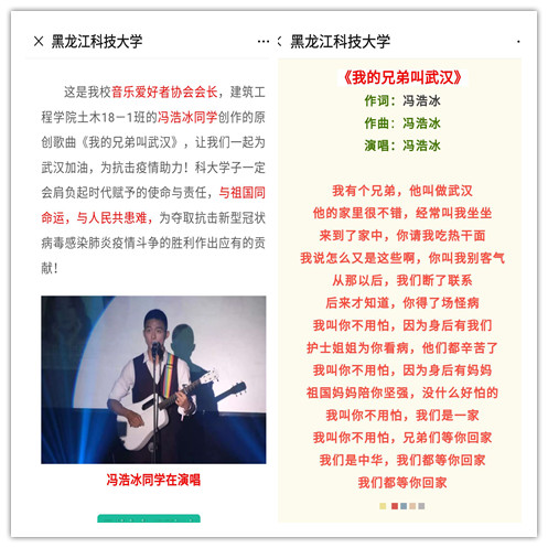 在全院各级各层的宣传引导下,涌现出了一批批热血青年,他们以自己的方式积极投身于抗击疫情的活动中。我院土木18-1班冯浩冰创作的原创歌曲《我的兄弟叫武汉》为打赢疫情防控攻坚战鼓劲,他用歌声与祖国同频共振,齐心战“疫”;我院道桥17-1班彭禹熊自愿担任家乡抗疫志愿者,协助开展疫情防控工作;程管18-3侯志文配合村镇书记在关键出入口值班站岗、登记排查进出入人员身体情况。他们的暖心举动在这场看不见硝烟的战争中展现出的是建工学子勇于担当的时代精神。