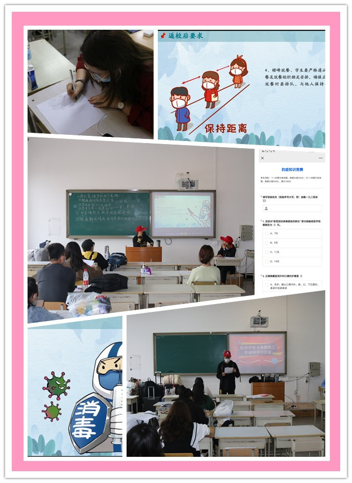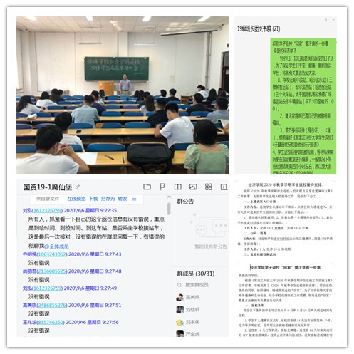 学工办精心编写了“经济学院学子返校‘回家’要注意的一些事”,通过学院“经海拾贝”公众平台、学生QQ群、班级微信群向全体学生推送返校要求及注意事项,指导班主任对学生返校前14天的健康状况进行全面摸排并通过电话、视频等方式“点对点”与学生进行确认返校行程,做到科学管理。召集49名学生志愿者提前返校,召开学生返校工作志愿者专题培训会议,做到精准服务。