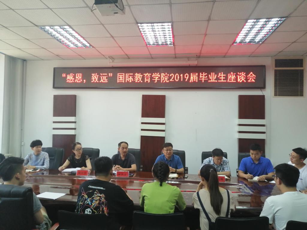 【国际教育学院】6月21日下午,国际教育学院在学院会议室召开2019届毕业生座谈会。由学生党员、公派留学生、学生干部、普通同学、家庭经济困难学生等层面组成的15名毕业生代表参加了座谈会。校党委常委、副校长陈凯云出席并讲话,国际教育学院院长母丽华,副院长杨兆楠,全体辅导员及部分毕业班班主出席,座谈会由学院党委书记邬承斌主持。