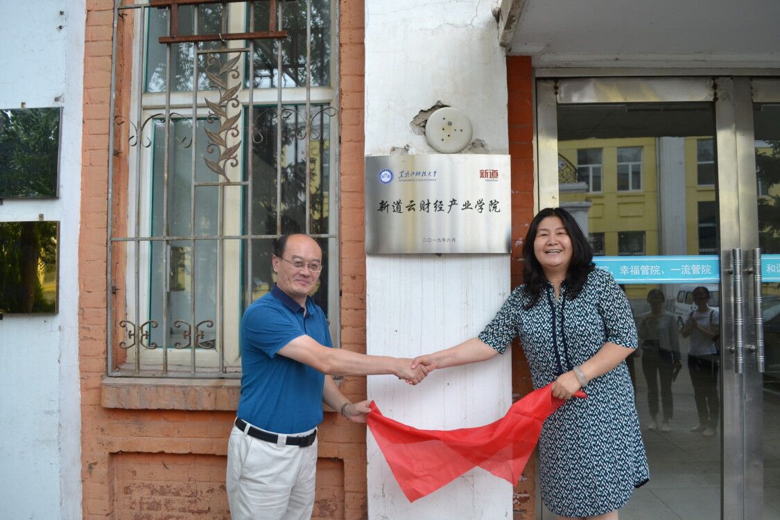 谭旭红与宋健进行“云财务管理会计”人才培养、产教融合、协同育人的协议签订,并为共建产业学院牌匾进行揭牌,“新道云财经产业学院”正式成立!