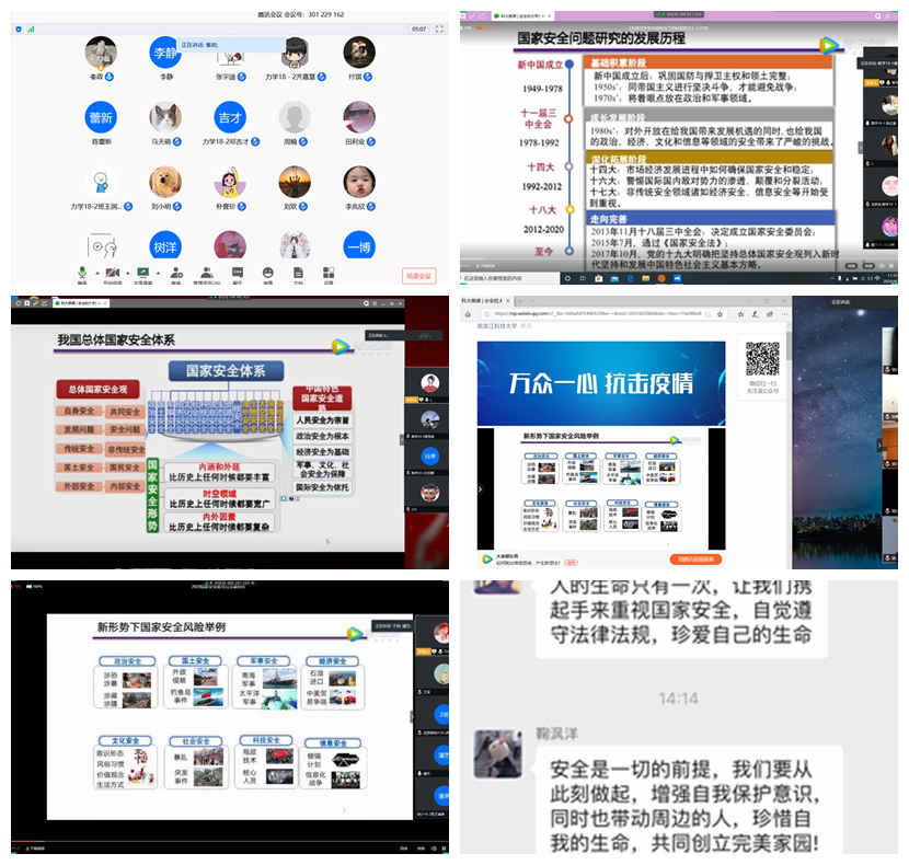 因地制宜,有效发挥网络阵地育人作用。国家安全教育活动期间加之疫情防护,理学院充分发挥网络平台便捷、高效的优势,利用微信公众平台推送国家安全知识,利用腾讯会议召开主题班会,利用QQ群、微信群发送活动通知,利用微信公众号宣传教育成果,实现了线上教育范围全覆盖、成果展示全天候。在教育活动中,全院学生积极参与、深入学习,对于习近平总书记关于全面依法治国、坚持总体国家安全观的重要思想、重要指示有了更深的认知与理解,认识了坚持总体国家安全观、维护国家安全的丰富内涵和重大意义。