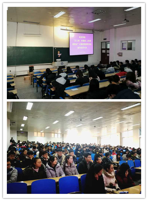 为深入学习贯彻落实学校下发的《关于在全校学生中开展“正三观 夯基础 人生路 感恩走”主题教育活动的实施方案》,经济学院结合学生工作实际,制定了《经济学院关于在全校学生中开展“正三观 夯基础 人生路 感恩走”主题教育活动的落实方案》,并于2017年12月4日、5日分三批,面向全体在校生,召开了“正三观 夯基础 人生路 感恩走”主题教育活动推进暨假前安全教育大会。经济学院党委副书记贺龙军、全体辅导员及部分班主任出席了大会。