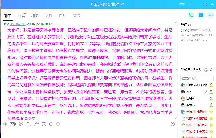 前置教育关口,注重在“谋”上下功夫。坚持两手抓,两手都要硬,在一手抓疫情防控的同时,一手抓学生线上学习教育。在学生网络线上开课前,学工办积极作为,主动谋划。一是对疫情防控期间学生线上学习教育管理提出了具体要求;二是建立了电信学院学生线上学习教育管理群,对管理群中的班级学生干部提出具体要求和明确目标;三是分年级组织召开了网络线上学习教育动员会议,督促学生提前调整作息时间,主动做好网上开课准备。
