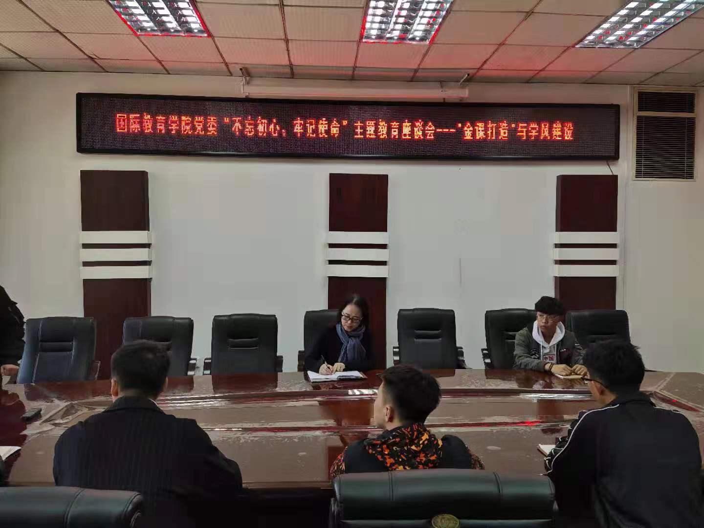 按照国际教育学院“不忘初心,牢记使命”主题教育工作方案的要求,10月14日,院长母丽华与各年级专业学生代表在科高0606会议室开展“金课打造”与学风建设为主题的的座谈会,倾听2015-2019级同学对教育教学,日常管理等方面的意见及建议。