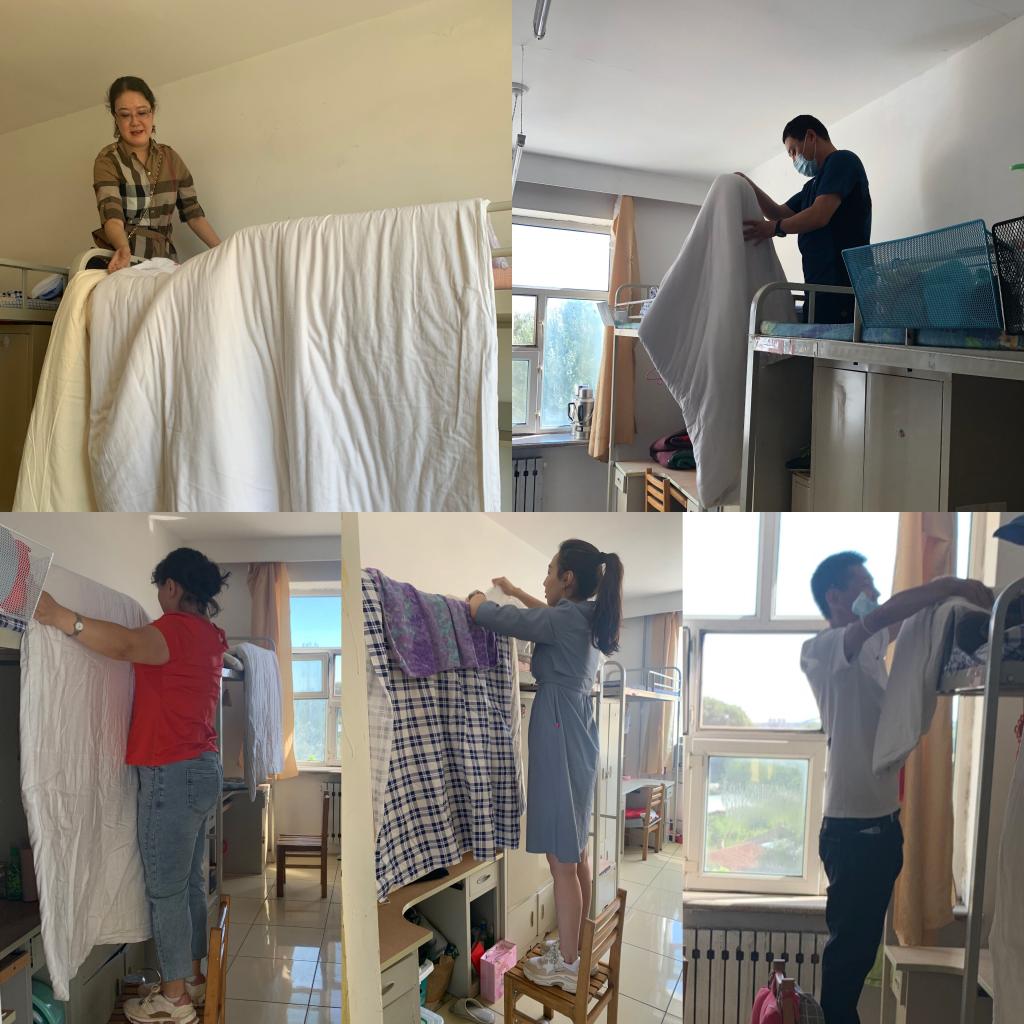 暖心服务,晾晒被褥系真情。学院在积极做好各项疫情防控工作的同时,更关心着学生们的寝室生活。考虑到学生寝室已半年多无人居住,被褥等物品长期放置在密闭房间内,容易出现潮湿、发霉、室内空气混浊等现象,8月21日,党委副书记张丽媛带领全体辅导员深入学生寝室,为即将返校的学生寝室开窗通风,晾晒被褥、清理易腐食品垃圾等。看似平常的生活举动,却给同学们带来了温暖,大家纷纷向老师们表示感谢,也对即将恢复的校园生活充满期待。
