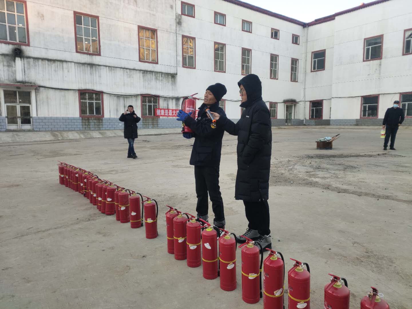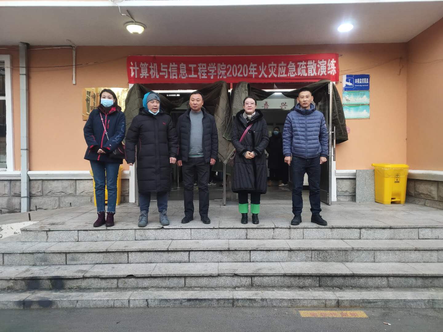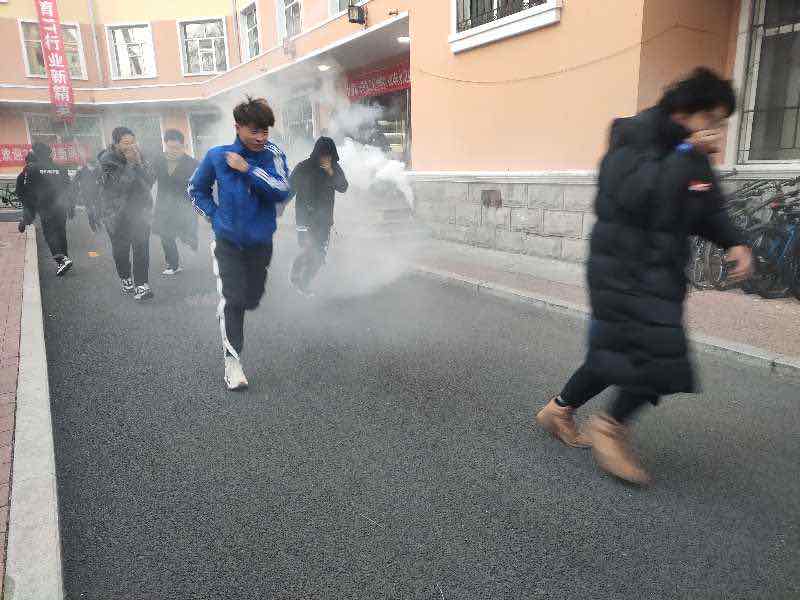 早6:30分,随着计算机学院党委副书记张丽媛宣布演练开始,拉响警报,保卫处工作人员在一楼安全通道准时引燃烟雾弹,2-7层楼层疏散管理人员同步吹响“警哨”,按照消防逃生规范,依次有序组织学生按照预先规划路线进行快速撤离,保证楼内学生的安全,以免在慌乱中出现拥挤或者踩伤学生的现象。 同学们撤离到指定安全区域后,保卫处赵铁山老师为全体同学演示手提式干粉灭火器的使用方法。讲解过后,每个班派出代表上前,学习安全正确使用灭火器。同学们一只手握住喷射软管前喷嘴根部,另一只手将开启把下压,迅速对准火焰根部,喷出干粉灭火。将演练火势迅速彻底扑灭。