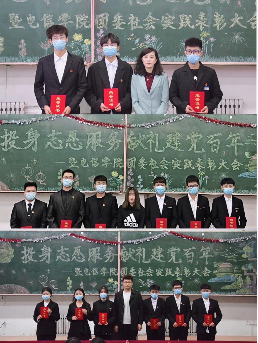 学院团委副书记孟凡贺对电信学院2020-2021学年第一学期寒假文化科技卫生“三下乡”社会实践开展情况进行了总结;学院团委副书记炼婕宣读了《共青团乐鱼网站_乐鱼(中国)电子与信息工程学院委员会关于表彰2020-2021学年第一学期寒假文化科技卫生“三下乡”社会实践“先进集体”和“先进个人”的决定》。与会人员为先进集体、 “最美志愿者”代表颁奖社会实践“先进个人”代表颁奖。