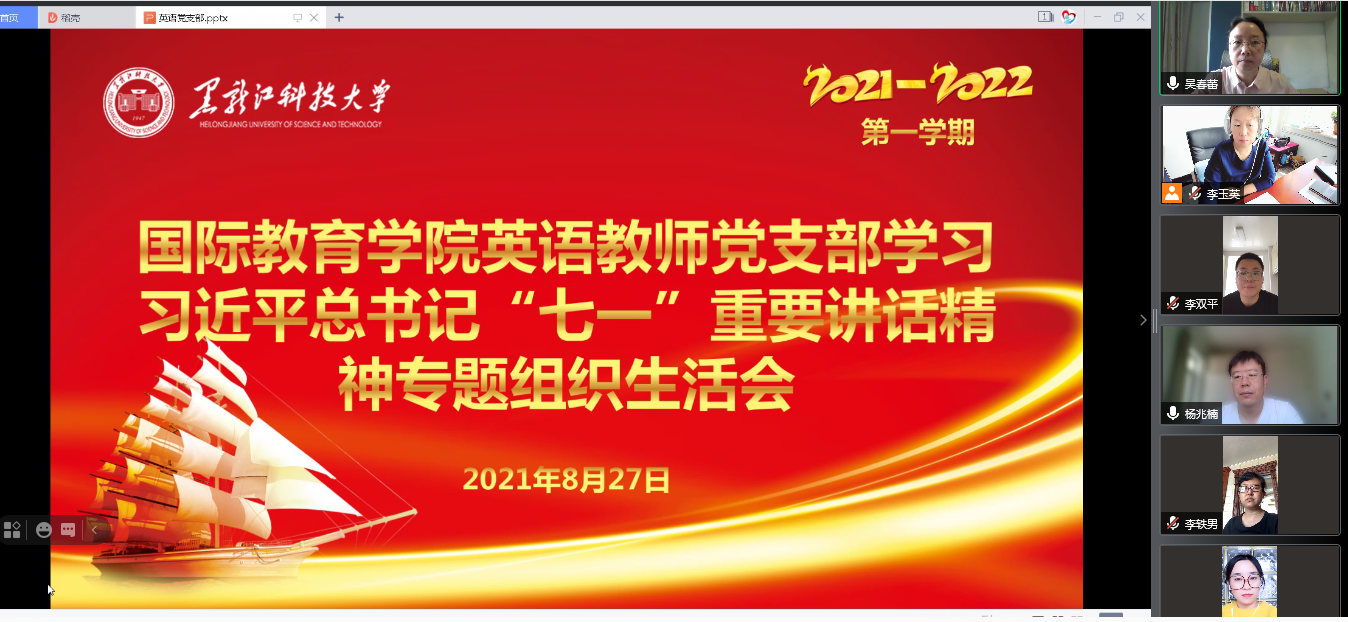 为切实提高学习的针对性和实效性,按照学院党委统一安排,国际教育学院各党支部在8月31前陆续召开了学习习近平总书记“七一”重要讲话精神专题组织生活会。组织生活会上,各支部党员围绕讲话精神谈认识、找差距、明方向,同时结合自身工作,结合学院、学校的发展,擘画“十四五”,共话新篇章。大家通过交流学习更加深刻地理解“七一”重要讲话的精神实质,切实增强了全体党员推动学校高质量发展的自觉性和坚定性,并决心精诚团结,守正创新、攻坚克难,向学校及学院 “十四五”规划的目标努力奋进、勇开新局。