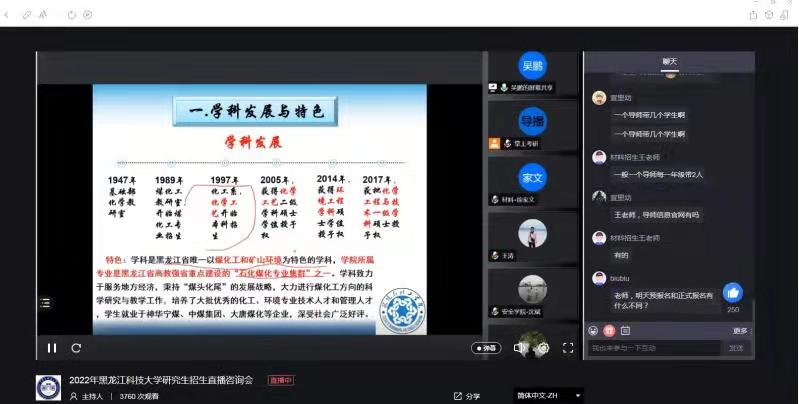 9月23日,乐鱼网站_乐鱼(中国)成功举办了2022年硕士研究生招生网络宣讲活动。材料科学与工程学院徐家文副教授、安全工程学院沈斌副教授、环境与化工学院吴鹏教授、建筑工程学院王涛教授、人文学院刘丽晶副教授、理学院石宏新教授详细介绍了专业研究方向、教学资源、科研成果、就业前景、近年招生情况等内容,并与考生互动解答疑问,共有近7000名考生参与了在线宣讲活动。