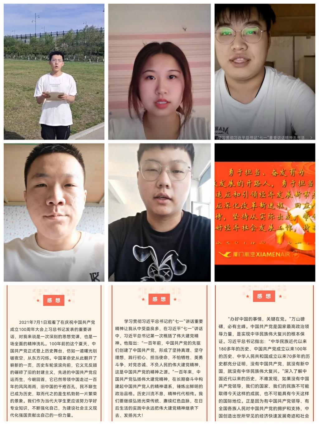 学党史,讲感悟。学生党员、团学干部通过录制视频的形式讲述对讲话精神的理解与感悟,并结合自己的实际情况和人生理想,谈论未来的人生规划与目标,纷纷表示定将不负时代,不负韶华,肩负起时代责任,不负党和人民的殷切期望。