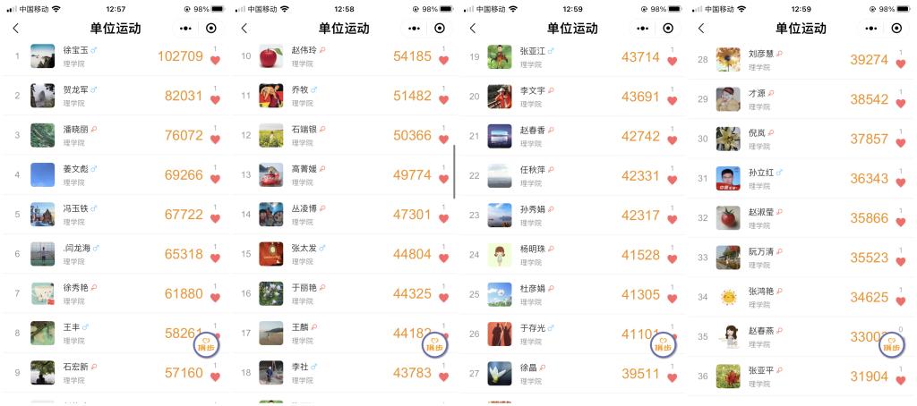 为了丰富广大教职工业余生活,强健体魄,理学院工会于2021年9月25日至2021年10月1日间开展了“迎国庆·庆丰收·健康行”活动。活动通过微信小程序“运动步数榜”统计参与人员每日步数,参与活动的教职工每日步数需达到6600步即可。