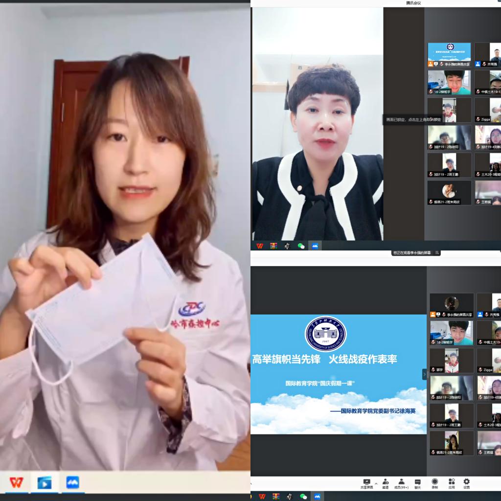 为守护校园安全稳定,加强同学们的爱国情怀,巩固党史学习教育成效,落实疫情安全防范教育,树立同学们坚定的抗疫信念,10月5日,国际教育学院组织开展了“国庆假期第一课”系列线上课堂活动。学院党委书记齐秀强、党委副书记徐海英分别以《守望相助传温暖 携手同心共战‘疫’”》和《高举旗帜当先锋 火线战疫作表率》为题为全院学生骨干、党员进行了国庆假期第一课,随后邀请了哈尔滨疾病预防控制中心付饶医师对我院全体青年学生进行了防疫常识科普课堂。