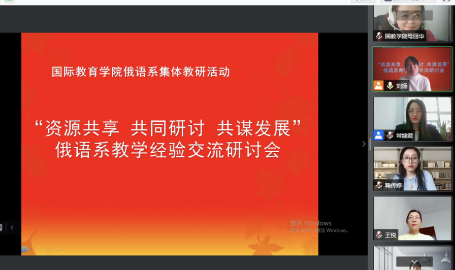 为进一步推进校本教研,培养年轻骨干教师,交流教学经验,提高教学质量,国际教育学院俄语系10月6日通过腾讯会议召开了“资源共享、共同研讨、共谋发展”线上教学经验交流研讨会,此次活动受到国际教育学院领导的高度重视,院长母丽华教授全程参与研讨并无私分享教学经验。