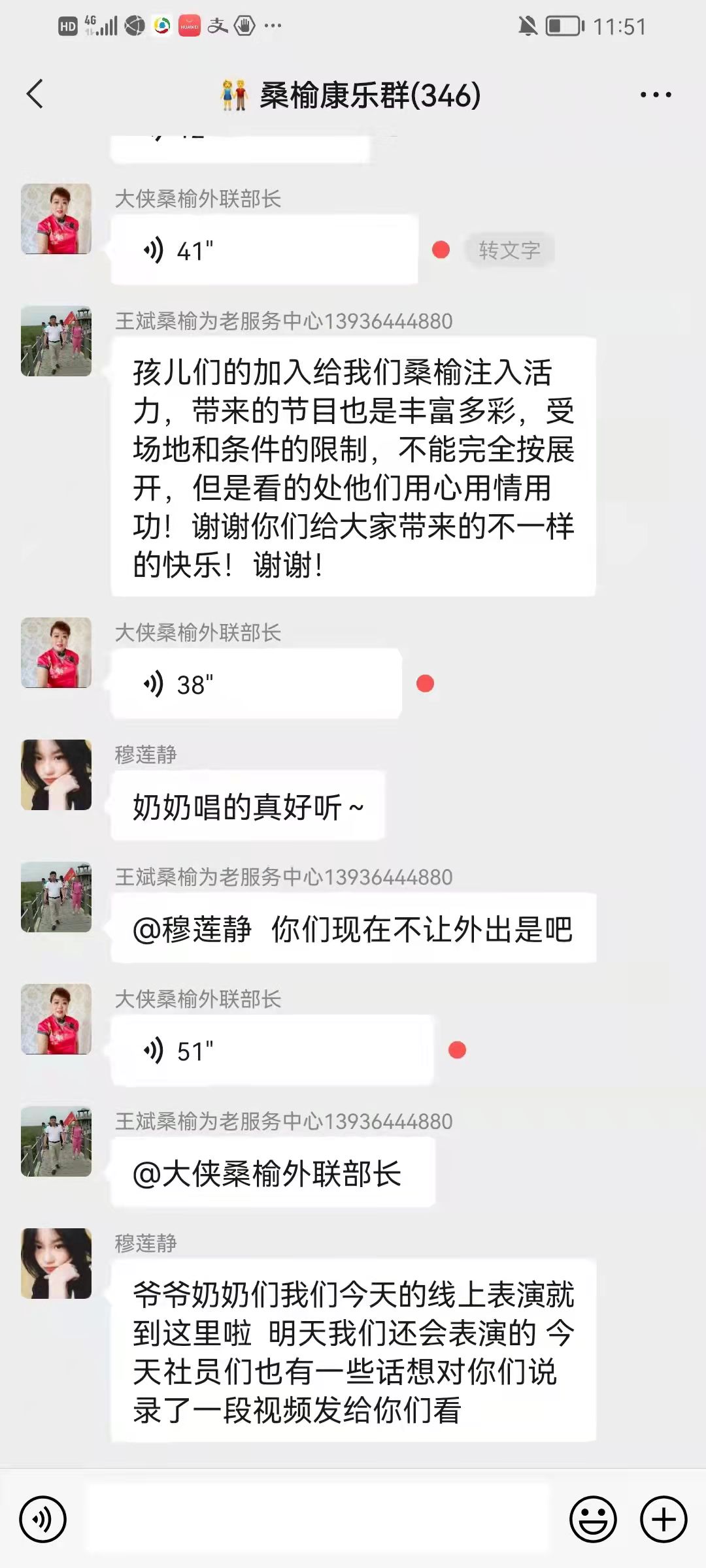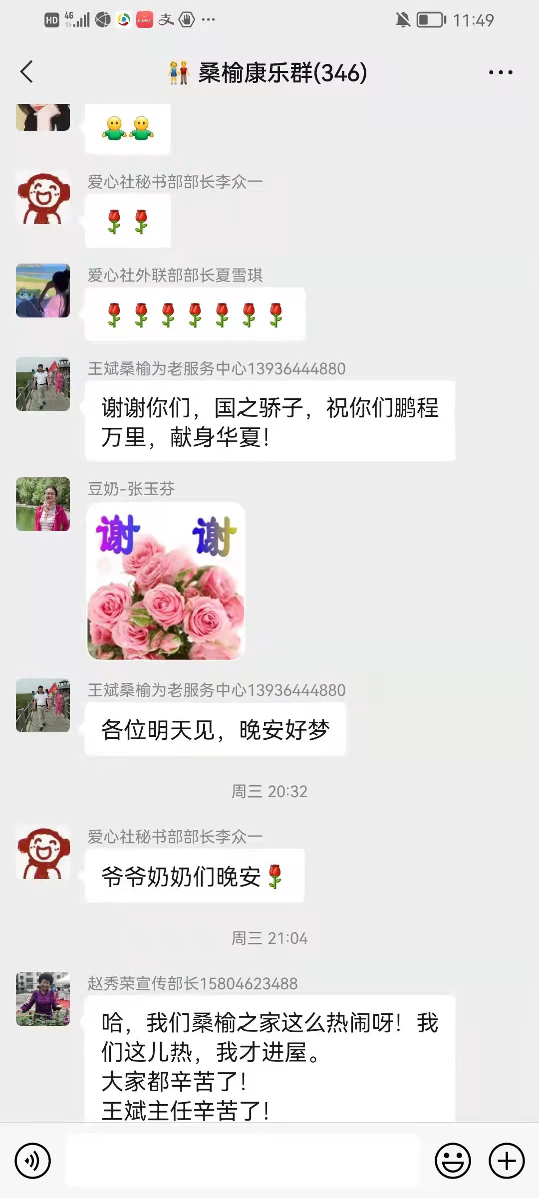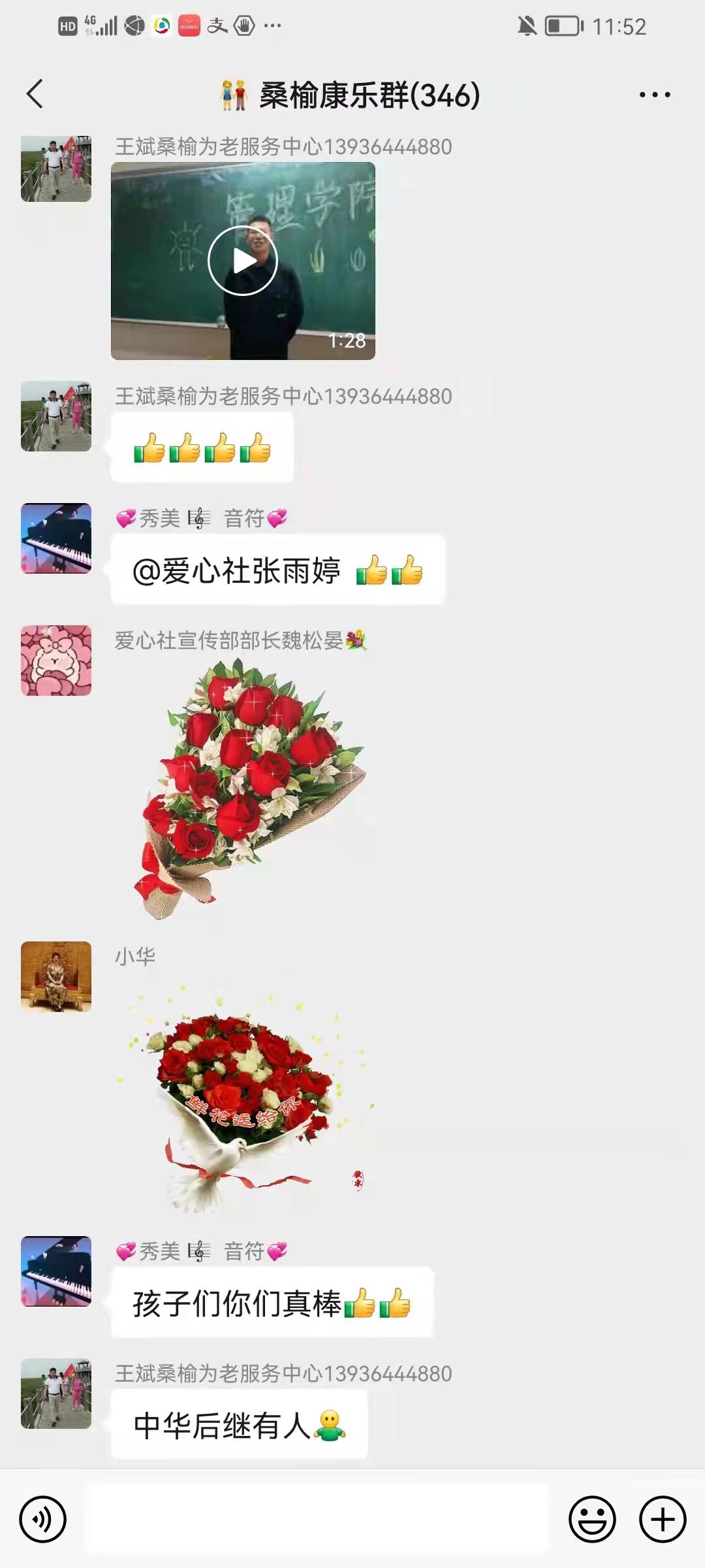 为了缓解他们居家期间情绪紧张的问题,爱心社的同学们以微信群内线上联欢的形式,录制了《太阳照常升起》口琴独奏等7个精彩的小节目,在学生们的带动下,群里的老人纷纷献唱《我和我的祖国》等歌曲,一同为祖国庆生。这种线上支持缓解了社区老人的心理压力,他们居家抗疫带来了欢声笑语。最后学生们录制了一个送出祝福的集体视频,把美好的祝愿送给了老人们,为这次线上服务画上了完美的句号。两天共服务7个小时,累计服务638人次。这次线上服务把抗击疫情必胜的信心带给了老人们,也体现了乐鱼网站_乐鱼(中国)大学生的责任感和精神风貌。