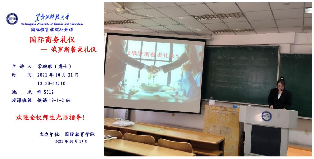 为进一步夯实新教师驾驭课堂教学的基本功,提高新教师的专业素养和教学能力,10月21日国际教育学院俄语系常碗君博士在科S312举办了公开课,本次课程的教学内容是《国际商务礼仪》中的“俄罗斯餐桌礼仪”。