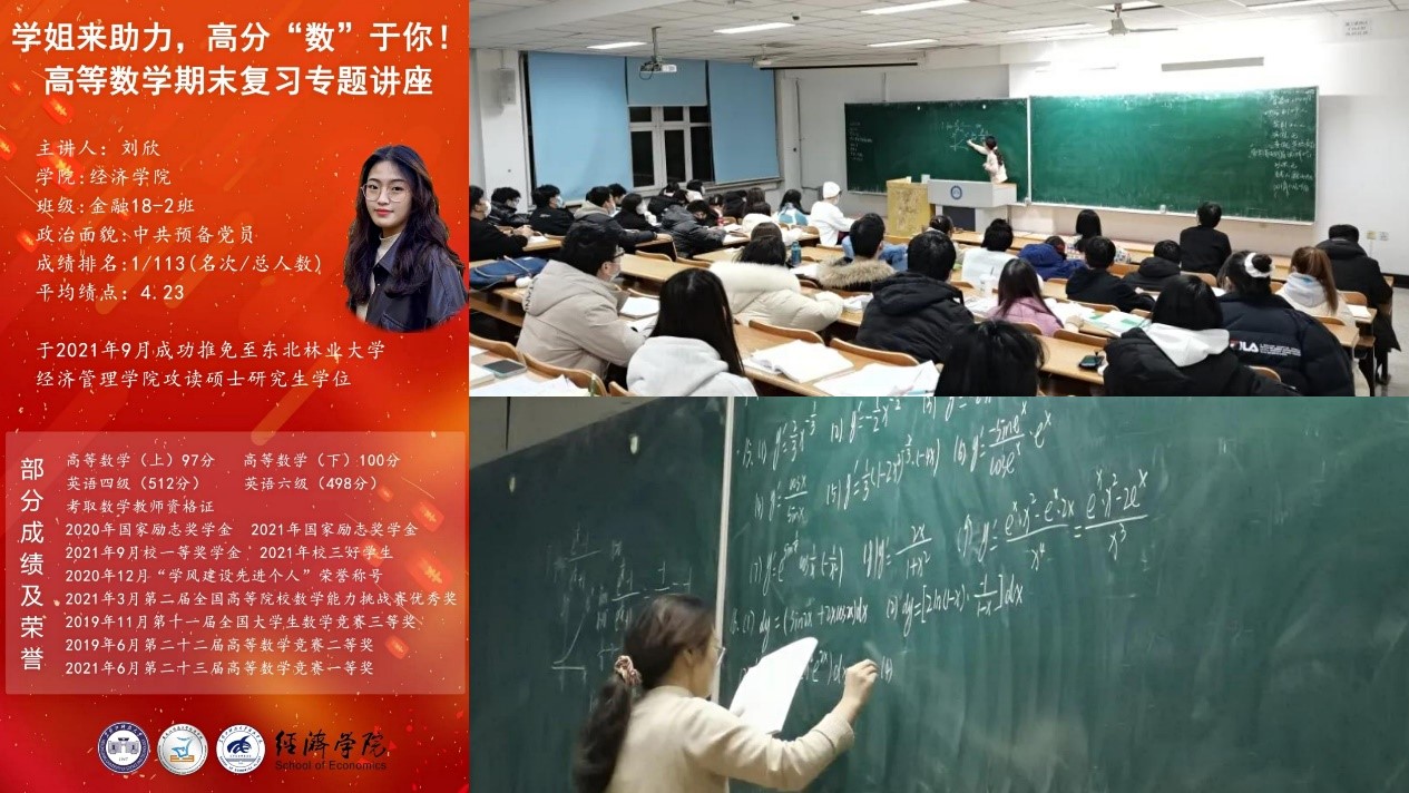 构建“辅学—帮扶”体系,实现学生互促互学。遵循大学生的成长规律,注重朋辈教育的辐射作用。举办“学霸讲堂”、“学姐助力讲高数”、学业帮扶“1对1”等团体和个体辅导活动,指导帮助低年级学生调整期末复习节奏,分享学习经验。线上线下相结合,开展“最美笔记”分享、“四级备考”讲座等,为学业困难学生提供全时段、多维度的学业帮扶。