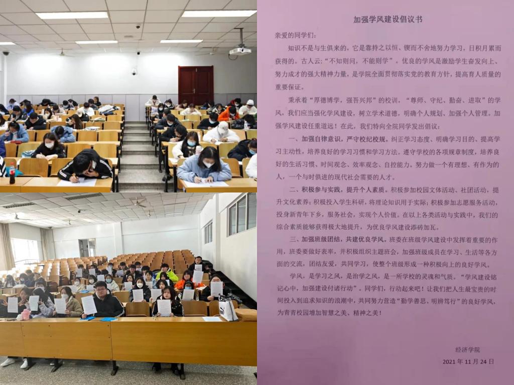 经济学院秉承“立德树人”的教育理念和“以人为本”的工作思路,深入推进精细化、全程化、立体化的学风管理,形成了以教风带学风、以管理促学风、以服务护学风、以环境育学风、以实绩彰学风的学风建设工作新格局,初步构建了“乐学—动力、辅学—帮扶、勤学—示范、督学—养成”四位一体学风建设体系,营造了比学赶超的育人氛围,提高人才培养质量。