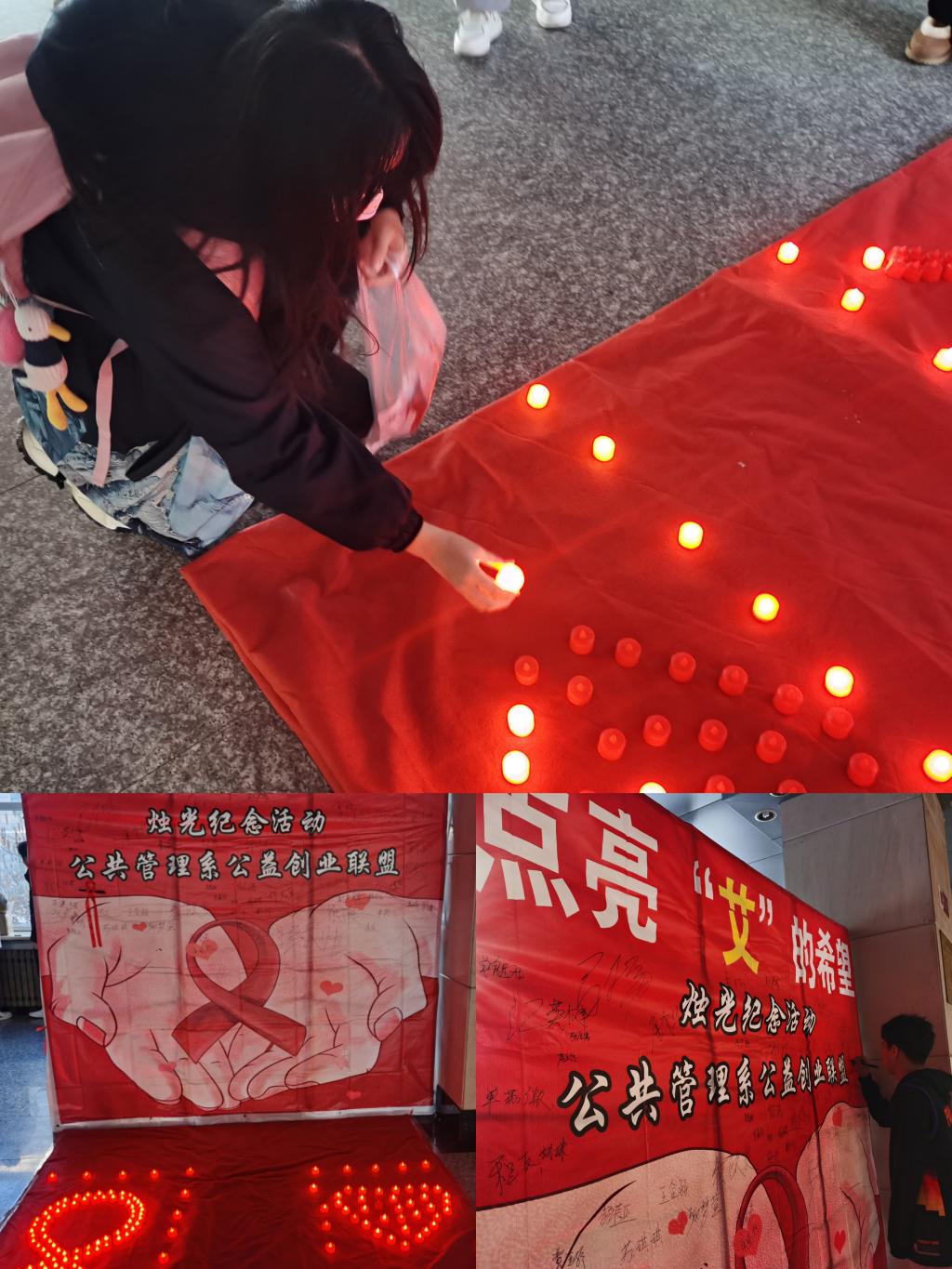 接着,课程组及公益创业联盟作为中国艾滋病防治协会志愿服务项目的承接方,在学院团委的支持下开展了“艾的鼓励”签名活动和点亮“艾”的希望宣传活动。参与的学生纷纷写下自己对艾滋病患者的鼓励与祝福、和玩偶拍照留念、点亮象征着“艾”的希望的电子蜡烛,并得到了防艾标志“红丝带”图样的徽章。两次活动反响良好,工作人员午休回到场地,条幅上又多了许多陌生却充满温暖的名字。