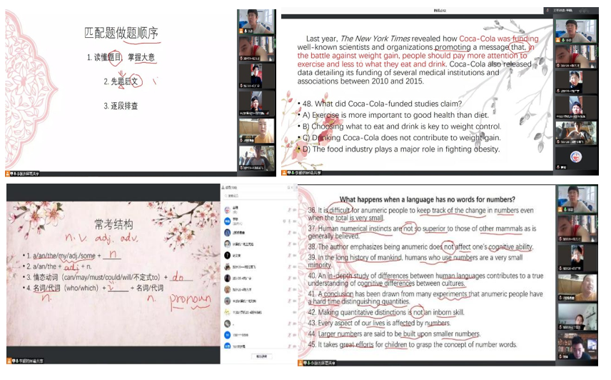 12月18日将举行全国大学英语四六级考试,学生们在紧张的复习期间难免会遇到各种问题,为解学生之所急,更好地帮助学生顺利通过考试,体现一切为了学生,为了学生一切的教育理念,使学生因为教师的服务获得更大程度的发展,国际教育学院英语教研室选派李颖老师于12月14日利用腾讯会议面向全校进行了一次四级真题讲解。