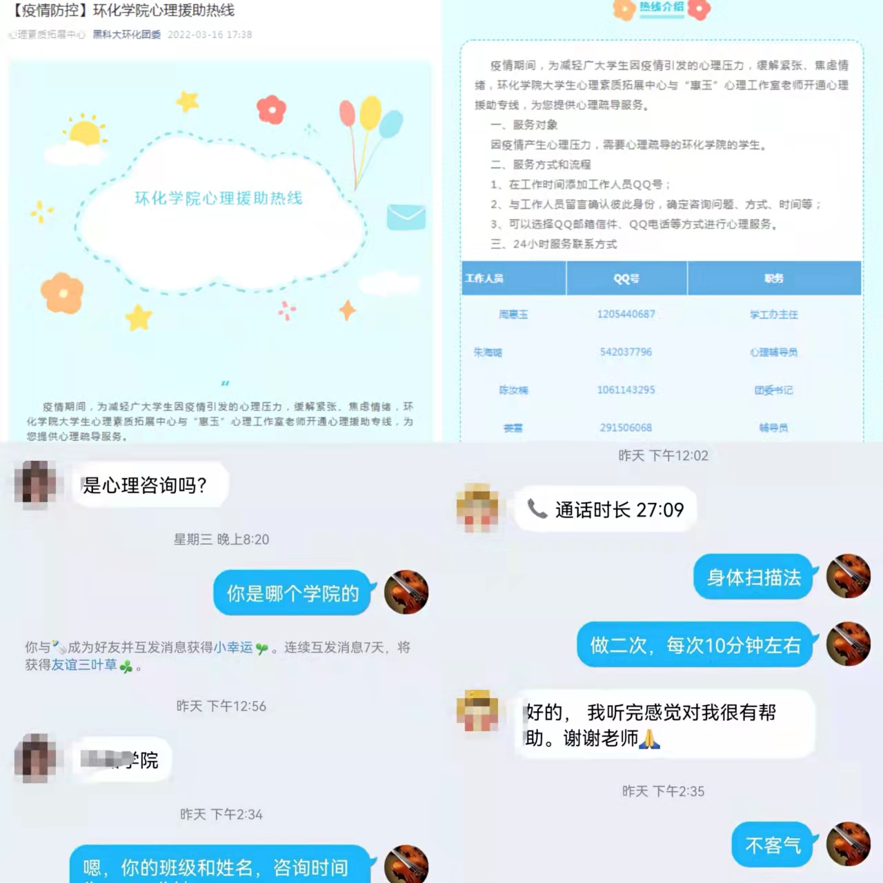 三是构建服务之维,构筑疫情防控形势下的有力保障。为缓解学生因疫情所导致的情绪焦虑等心理异常情况,学院开通24小时心理援助热线,“惠玉”心理工作室老师和学院大学生心理素质拓展中心学生为有需要的学生提供心理咨询服务,帮助同学们解决问题。