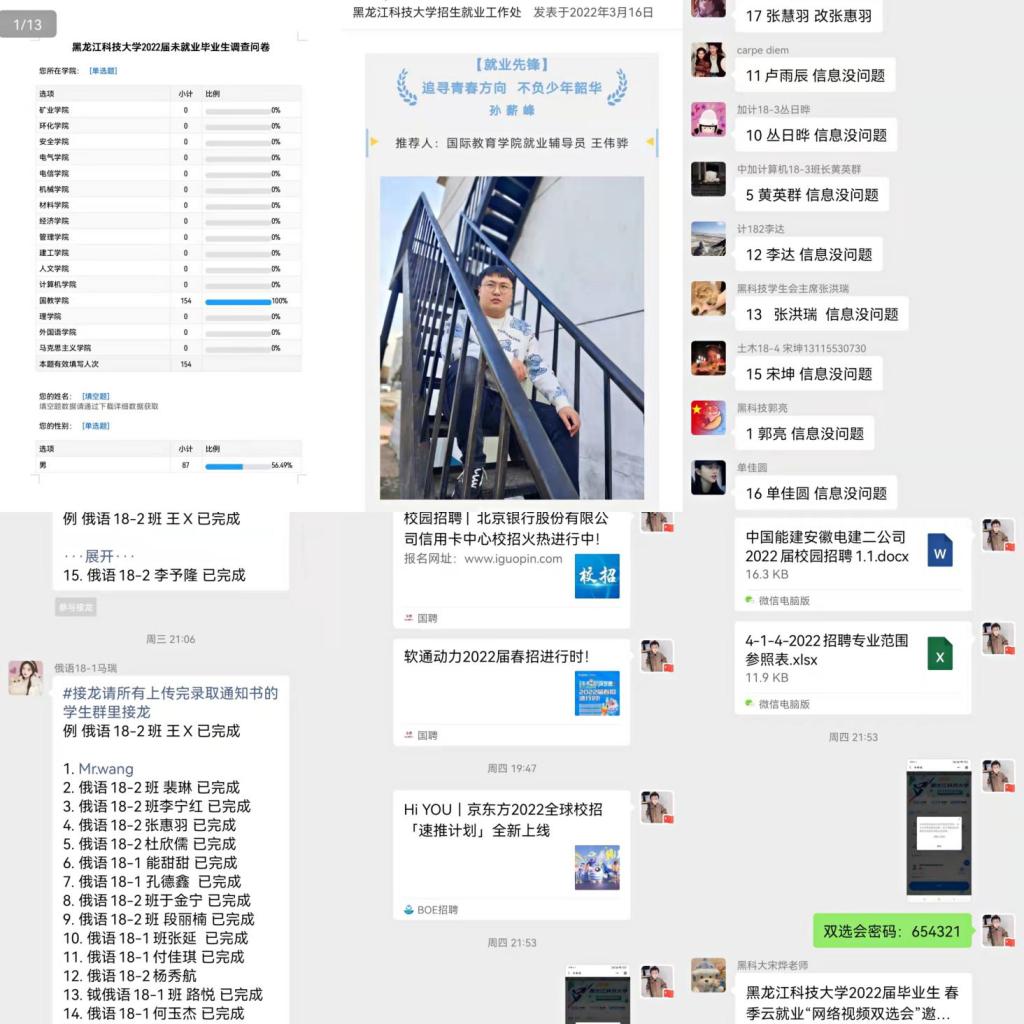 为及时对接毕业生求职需求,做到不停歇、不缺位,根据招就处安排的调查问卷精准掌握每一名学生的就业意向及需求,分类汇总就业信息,分别建立“就业信息速递群”、“出国留学群”、“选调生助力群”、“考研上岸群”、“国企事业单位推送群”分类解决学生面临的各种需求;针对俄语专业,国际教育学院联合国际合作处共同召开毕业生高质量就业处、院联合推进会,与俄罗斯南乌拉尔国立人文师范大学建立了友好合作关系,俄语专业16名学生获得了该校硕士研究生录取通知书;针对报考选调生的17名学生,学院设立专门自习室,定期为学生答疑解惑;针对考研过国家线的16名学生,田晨就考研复试、调剂的相关内容进行了专题指导;通过就业先锋分享自己的求职历程、求职感悟、个人建议使学生们感受到就业环境的严峻性和复杂性,明确了个人能力、清晰自身需求、端正求职态度。