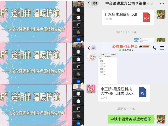 就业工作重实效。一是分类指导,精准帮扶。开展毕业生就业意向问卷调查,根据调查结果进行分类指导,将就业信息“点对点”、“键对键”推送给毕业生,同时根据招聘单位的用人需求,将毕业生简历精准推送到招聘单位。二是密切沟通,用心帮扶。全院教师加强与未就业毕业生沟通交流,通过走访寝室、微信、电话等形式与学生沟通,了解毕业生求职过程中遇到的困难与需求,并根据学生实际及时给予指导与帮扶。三是助力研途,温暖帮扶。做好毕业生考研复试与调剂指导服务工作,为考研毕业生提供复试专用教室,召开“‘研’途有你 温暖护航”线上分享会,邀请现就读于清华大学的2017级毕业生代金辰、中国人民大学的2017级毕业生姚敏、东北林业大学拟录取的2018级丛硕,分别对考研复试准备、复试技巧等方面进行指导,助推毕业生顺利复试。