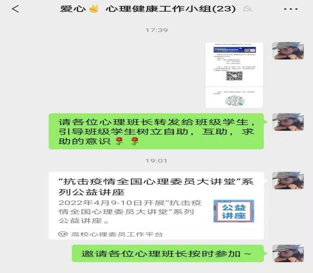 学院依托微信公众号、微信工作群、腾讯会议等平台,通过分享心理健康小故事、推送心理健康课程、开展心理云班会等方式向学生宣传心理健康知识和心理保健技巧,加大心理健康教育与宣传力度,帮助学生更好的掌握心理健康知识和技能,从而增强全体学生心理困扰应对能力;通过指导学生使用学校心理中心提供的线上、线下心理咨询预约方式,增强学生关注自身心理健康的意识,积极引导学生树立自助、互助、求助的意识,帮助学生学会积极主动解决困扰学习和生活的心理问题,培养阳光心态,理性面对挫折和困难。