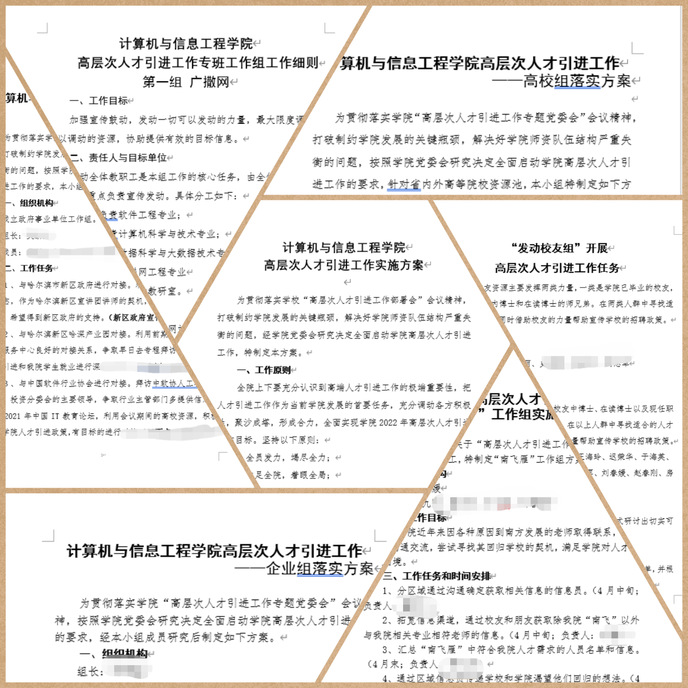 今年3月,学院两次召开党委会专项研究人才引进工作,研究制定了《计算机与信息工程学院高层次人才引进工作方案》,明确了高层次人才引进工作的总体方针。会议决定,成立计算机学院高层次人才引进工作专班,根据“寻找目标”阶段的7个重点工作方向,成立了7个工作组,党委委员为工作组主要成员。各工作组分别制定了详细的工作细则,用于指导工作开展。