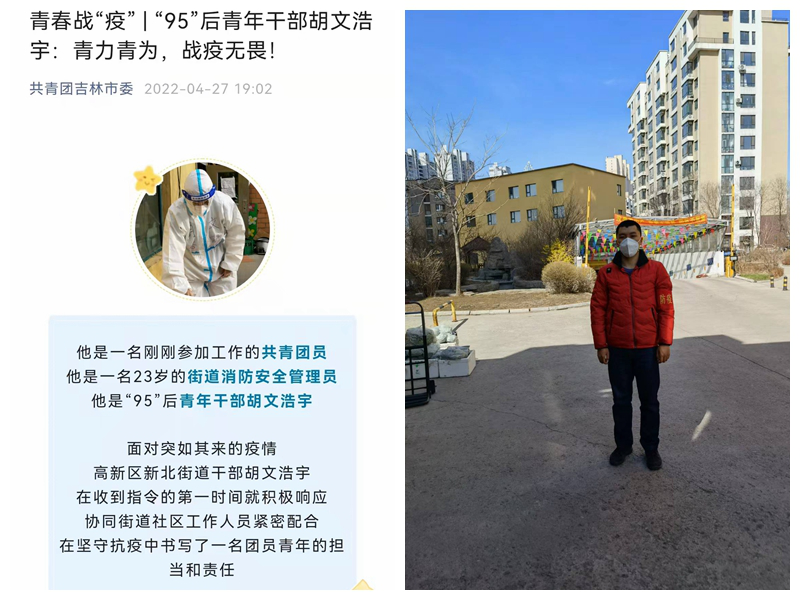 胡文浩宇,乐鱼网站_乐鱼(中国)管理学院会计硕士非全日制研究生,2020年9月入学,2021年考入吉林市高新区新北街道消防安全管理岗位。2022年3月以来,面对突如其来的严峻疫情形势,胡文浩宇在收到指令的第一时间就积极响应,协同街道社区工作人员紧密配合,在坚守抗疫中书写了一名作为黑乐鱼网站_乐鱼(中国)学子的担当。