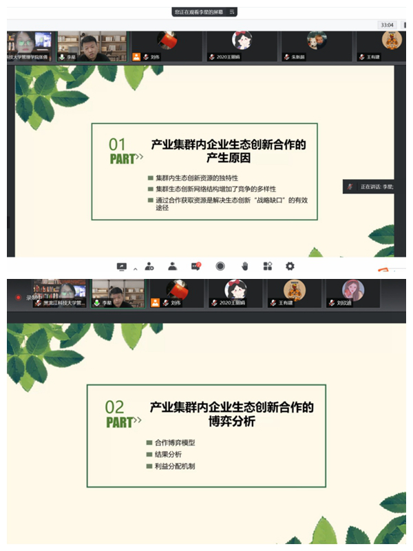 报告会上,李星教授从产业集群内企业生态创新合作的产生原因、产业集群内企业生态创新合作的博弈分析、产业集群内企业生态创新合作的信任机制三个方面进行了详细介绍。学术报告后进入互动交流环节,参会研究生踊跃提问、积极研讨、畅所欲言。通过李星教授的精彩阐释,师生纷纷表示深受启发,对产业集群内企业的生态创新知识有了深入掌握,开拓了学术视野,激发了潜心科研的兴趣与动力。此次报告为各学科之间交叉融合提供了新方向,为师生进行学术研究提供了新思路。