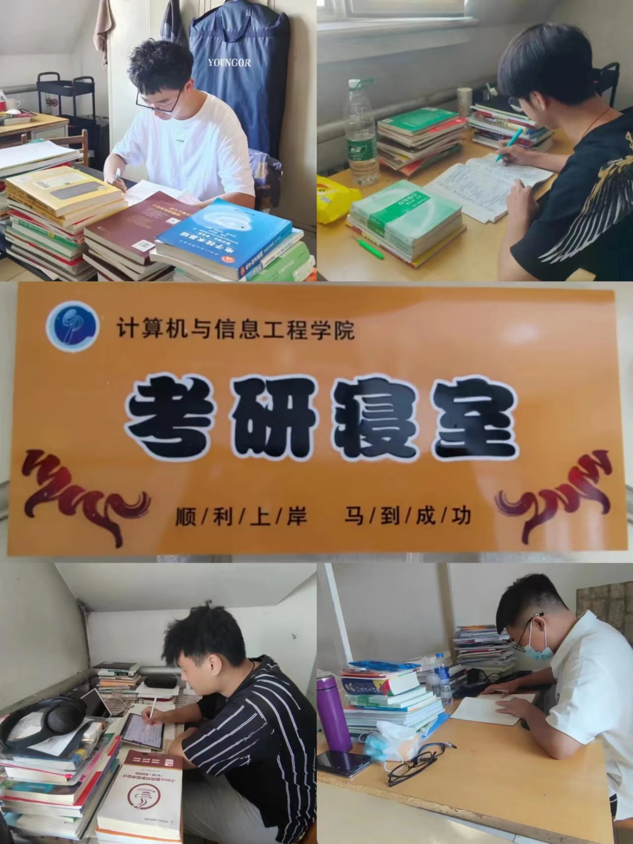 打造“圆梦屋”,汲取同辈力量。在学院党委指导下,计算机学院为考研学生设立考研寝室,将14公寓七楼12间学生寝室打造成“考研圆梦屋”,营造温馨学习环境。寝室门牌设计取义“马到成功”,希望寝室成员相互督促,共同努力,砥砺深耕,共创考研奇迹。