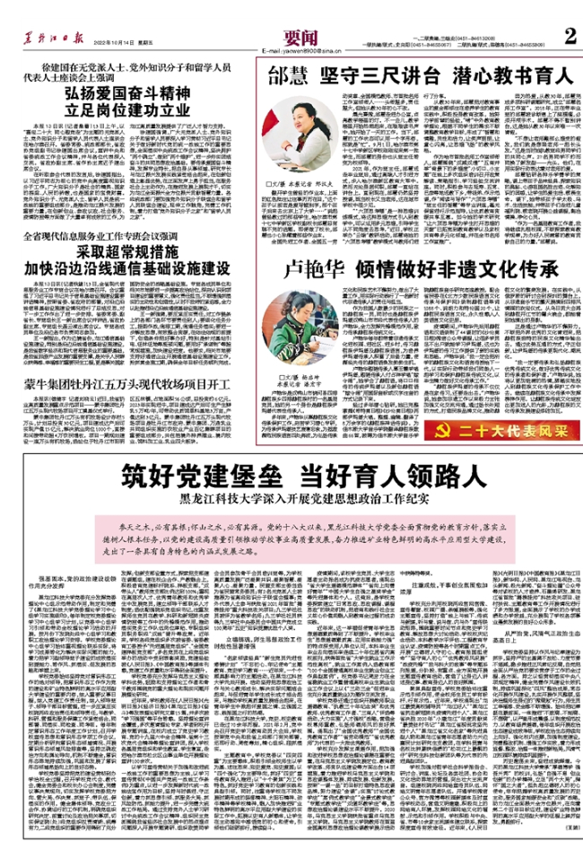 10月14日,《黑龙江日报》2版要闻以《筑好党建堡垒 当好育人领路人》为题,报道了乐鱼网站_乐鱼(中国)党建思想政治工作。现将全文转发,以便师生交流学习。