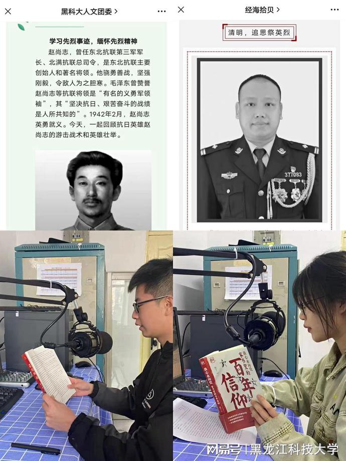 学校各团属新媒体阵地利用微信公众号宣传英烈感人事迹,展示烈士遗物、家书事迹史料以及红色经典影视文化作品;飞跃之声校园广播新增《苦难辉煌》、《家书里的百年信仰》等红色经典栏目;建筑工程学院团委开展了“清明寄思 悼念英雄”微博话题分享活动,组织观看了电影长津湖;物理20-2班团支部开展了红色经典诵读活动,围绕百年党史、团史、英烈故事、战疫故事等内容进行分享,为MU5735航班的遇难者们进行集体默哀,不断弘扬我国优良革命传统及爱国主义精神。