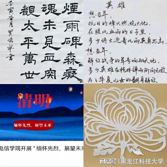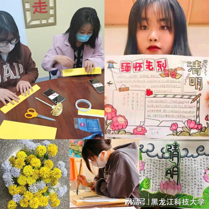 校学生会开展了“菊花寄哀思 后人祭先烈”手工制作活动,成员们互相学习手工菊花的制作方法和技巧,剪纸、涂胶、叠花瓣、裁叶子,每一瓣都饱含了对革命先烈的崇敬之情。太阳石文学社、剪纸书画协会的同学们通过手写祝福、散文诗歌、剪纸等活动寄托哀思,国教学院团委、马克思学院团委举办了手抄报大赛,电信学院团委举办了“缅怀先烈 展望未来”主题征文比赛,不同的形式,相同的心情表达着对英烈的敬仰与追忆。