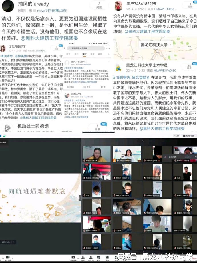 柳青东风暖,抗疫万众心,缅怀先烈志,网络祭英魂。清明节前夕,校团委官方微信公众号开设了“网上祭英烈”专栏,组织全校团员青年们线上观看“弘扬英烈精神 赓续红色血脉”主题云团课和“清明祭英烈”云直播,在线上走进烈士陵园,聆听英烈故事,深切缅怀革命先烈丰功伟绩。外国语学院团委、研究生学院团委组织团员青年通过网上献花、留言等多种形式,以文明、绿色的新方式纪念前辈,重温了他们的精神遗产,积极引领了学习英烈、致敬英烈、传承英烈精神的校园风尚。