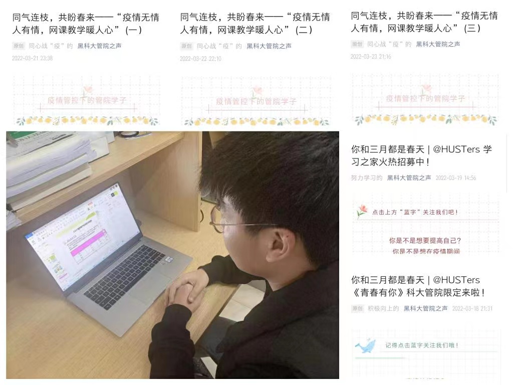 “云活动”伴航,筑牢学生防疫信心。学院以“青年大学习”为依托,以“管院之声”公众号为载体,开展了“艺”起战“疫”线上风采展、“同气连枝,共盼春来--疫情无情人有情,网课教学暖人心”等系列活动提升学生的参与积极性,开设了“你和三月都是春天”学习之家线上学习交流活动,通过学习打卡方式相互督促,引导学生以健康向上的面貌投入线上学习。
