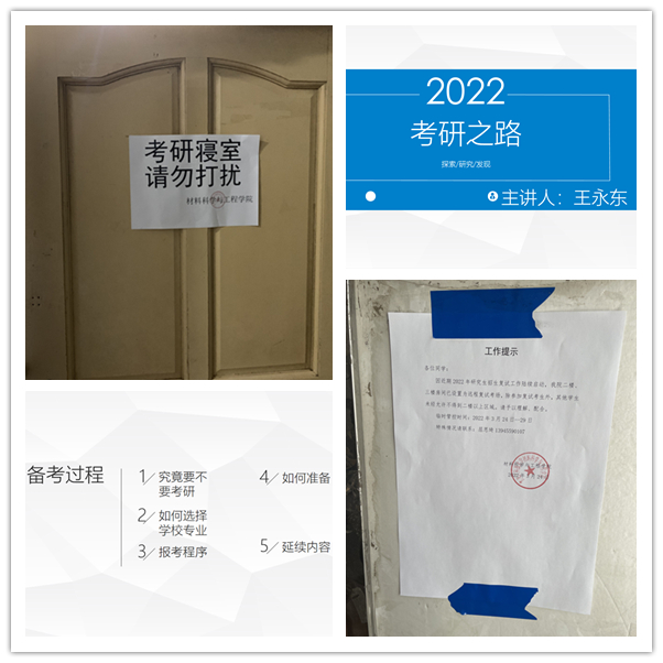 找准“需求点”,设立考研“学习专区”。近两年,受疫情影响,考研学生数逐年增加,学生考研压力逐年加大。针对这种情况,材料学院从去年初就开始谋划、指导考研学生积极备考事宜。为缓解学生在图书馆一座难求的状况,材料学院将办公楼内机房和会议室设为考研自习室。同时,积极协调学生处、后勤管理处等职能部门,在学生公寓设立了22个考研寝室,适当延长供电时间。邀请经验丰富的硕士生导师和往届考取名校的校友,为考研学生进行备考辅导,对于学生参加各类培训讲座提供必要的支持,对于家庭困难学生提供必要的帮扶。