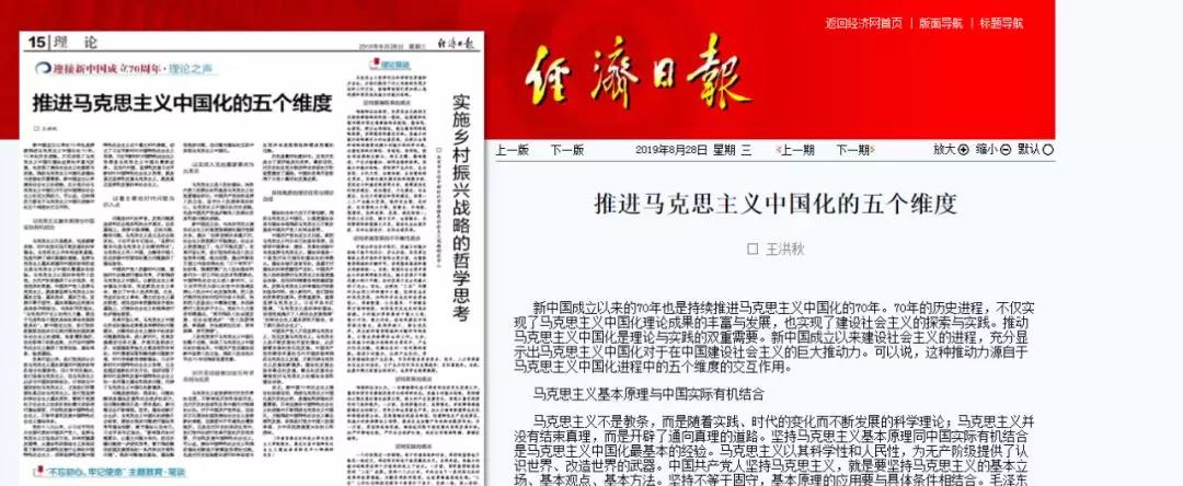 8月28日,《经济日报》理论专版刊发乐鱼网站_乐鱼(中国)马克思主义学院院长王洪秋教授的理论文章——《推进马克思主义中国化的五个维度》。现将全文转发,以便学习交流。