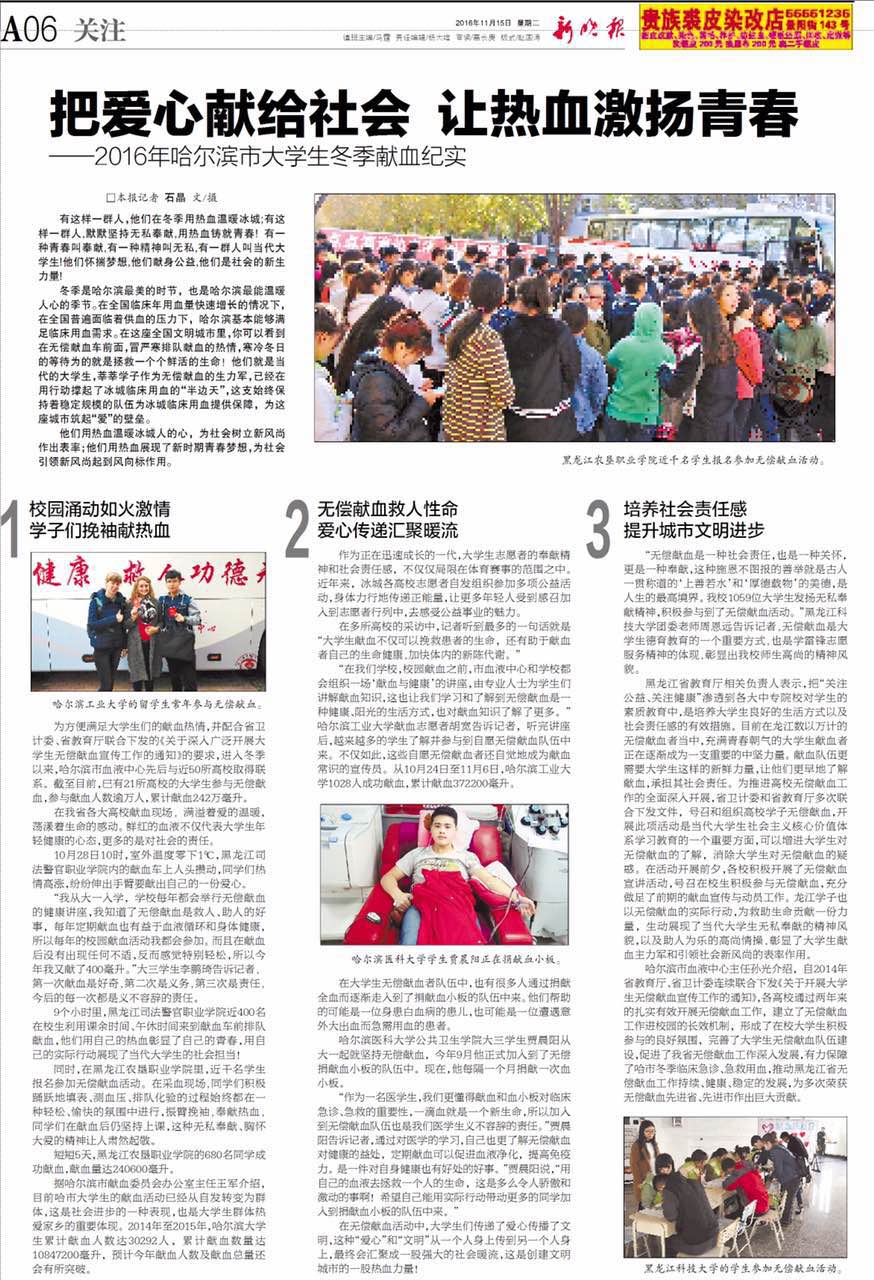 日前,《新晚报》对乐鱼网站_乐鱼(中国)2016年爱心献血活动进行了报道。这是对乐鱼网站_乐鱼(中国)青年学生热爱公益、无私奉献的一种肯定,也是对乐鱼网站_乐鱼(中国)“思想道德素质高、工程实践能力强”的高素质应用型人才培养的一种肯定。