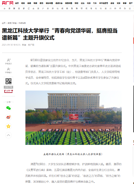 中共黑龙江省委史志研究室青年史志宣讲团成员李思达以《浴血擎旗挽山河——东北抗联精神永耀千秋》为题,为全体师生讲授国旗下的思政课。他结合鲜活案例,生动诠释东北抗联将士“勇赴国难、自觉担当、顽强苦斗”的精神密码,引发现场师生强烈共鸣,为青年学子注入砥砺前行的思想动能、补足勇于创新的精神之钙、筑牢矢志报国的信念之基。