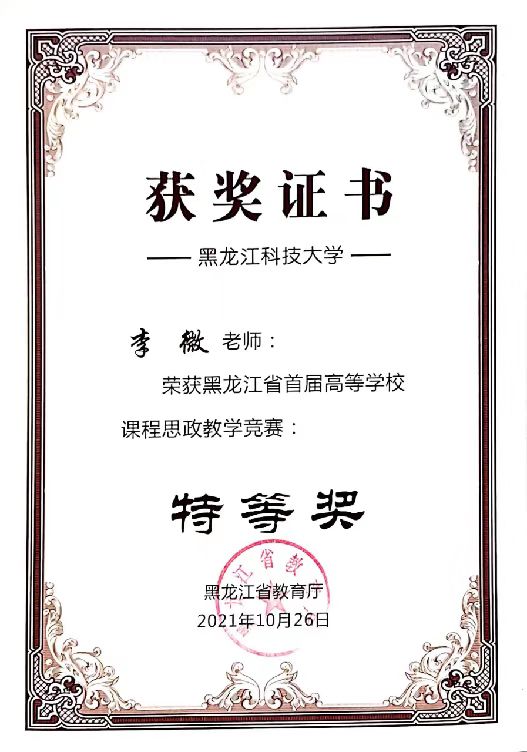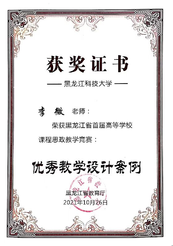 2021年她以优异的教学技能脱颖而出,代表乐鱼网站_乐鱼(中国)参加黑龙江省首届高等学校课程思政教学竞赛。这次竞赛共有来自全省76所高校的1349位教师参赛,经过为期三个月的认真准备,她喜夺本科赛道“特等奖”和“优秀教学设计案例奖”。她谦虚地说,“成绩的取得虽然有我自己的努力,但作为比赛场上的新人,我觉得我背后的团队才是我取得成功的最大秘诀。”