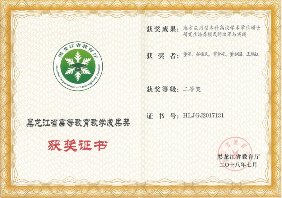 深化教育教学改革,促进研究生培养质量持续提升。一是深入开展以“学生为中心”的研讨式教学。如讲授《先进制造技术》时,教师提前让学生查阅国内外先进制造技术的方法和技术手段等,然后再通过课堂讨论等方式,激发了学生的创新思维与能力。二是建立校级督导、院级督导及学生问卷调查的三级监控,坚持构建“全员参与、全程覆盖、全因素管理”的闭环反馈教学质量保障体系,提高研究生培养质量。三是教育教学改革成果显著,主持的《地方应用型本科高校学术学位硕士研究生培养模式的改革与实践》获黑龙江省高等教育教学成果奖二等奖,实现了乐鱼网站_乐鱼(中国)零的突破。